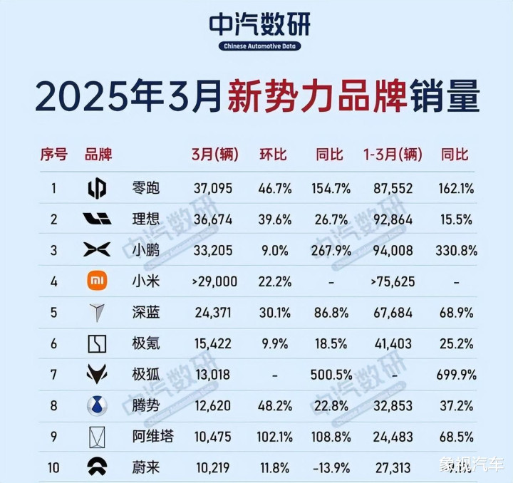 中汽数研数据显示,刚刚过去的3月份,蔚来仅售出10219辆,在十强榜单上排名垫底;同比下滑13.9%,是十强榜单上唯一下滑的新势力。